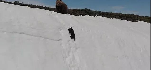 在俄罗斯马加丹州的一处山坡上,一对熊母子一同爬雪坡,母亲刚刚爬上山顶,小熊却怎么也爬不上来,多次滑落到山脚下。母熊一直在山顶看着,似乎在说:“加油跟上来!”