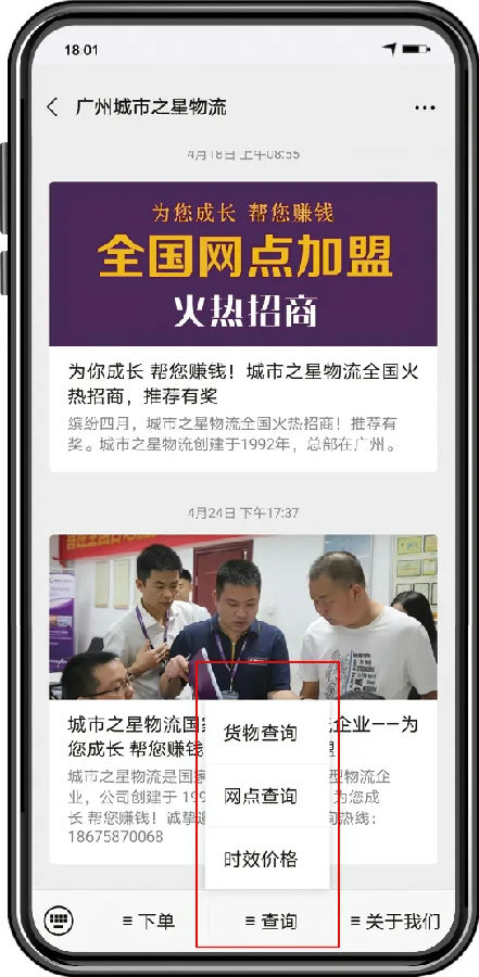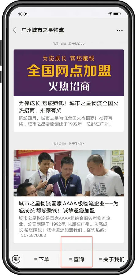 最近公众号后台收到不少客户查询货物的运单图片、语音、单号等查询问题,在此声明一下,通过公众号发布消息,后台不会自动为您查询的。下面为大家介绍一下,如何通过城市之星物流微信公众号查询货物、网点信息等。