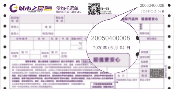 单号:城市之星单号是机打数字,在运单的右上角,由11位数字组成